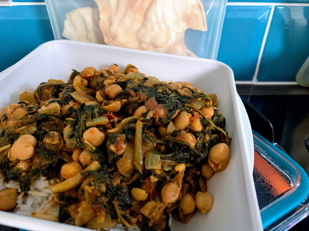 Ik heb voor mijn middageten, de restjes van gisteravond. Ik maak meer eten zodat we hebben middageten op de naaste dag. En vandaag, ik heb kikkererwten en spinazie curry met rijst. Het is een van mijn favourite maaltijden.