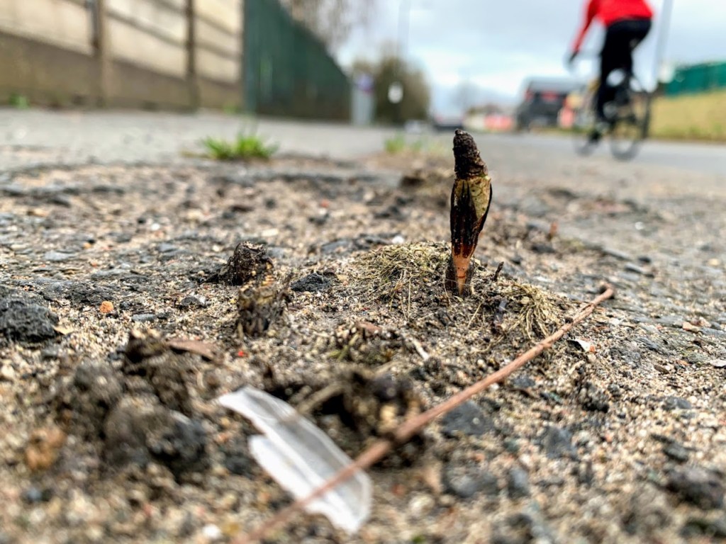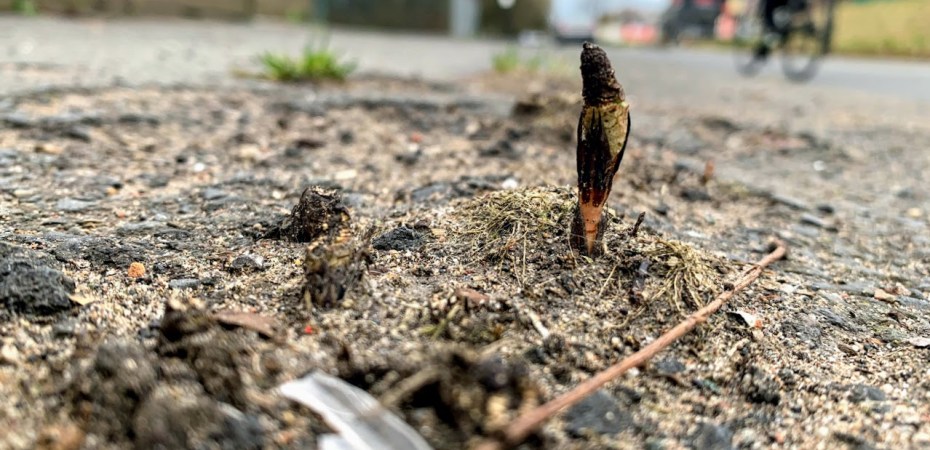 Deze ochtend, op mijn wandeling ik heb een plantje gezien. Het heet “Mare’s Tail” en kom uit prehistorische tijden dus is het erg sterk. Het kan door de harde grond komen! Ik heb mijn vriend vertelled over deze plantje dus ik moest een foto. Dus er was ik op de grond!