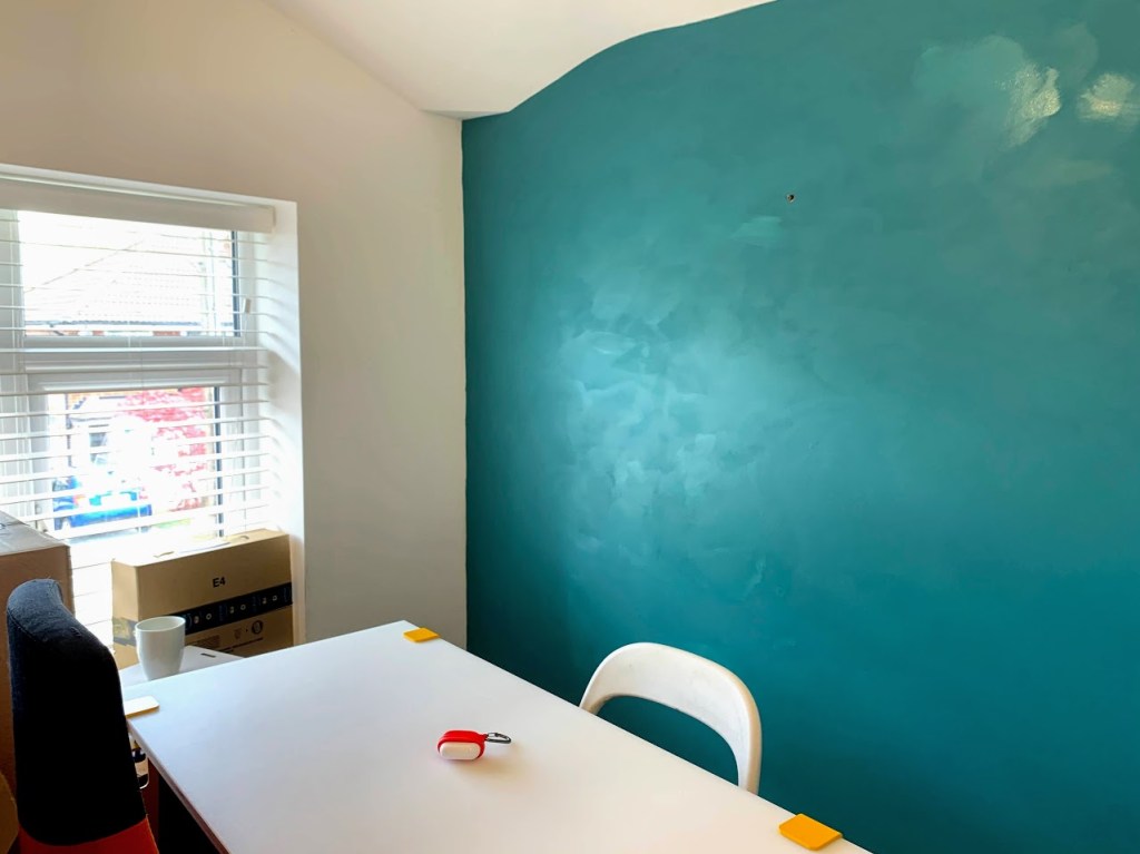 Toen we het huis kochten, vond ik het een beetje grijs. Terwijl ik mijn studio aan het organiseren was, dacht ik dat ik mijn studio zou moeten decoreren. Van grijs in de ochtend tot groenblauw in de middag. Ik denk het is nu veel mooier! Wat denk jij?