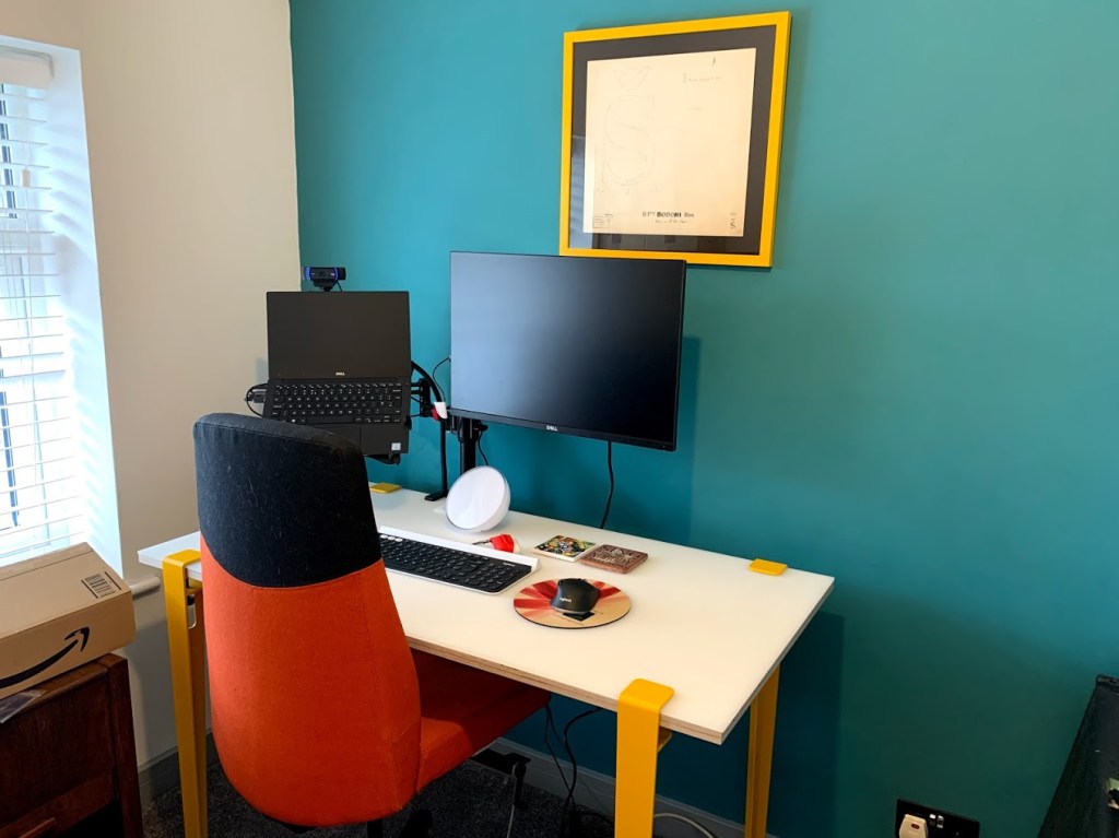 Omdat ik morgen mijn Nederlandse les heb, moest ik mijn studio organiseren. Het is nog steeds rommelig, maar ik heb een bureau, mijn computer, scherm en mijn webcam. Dus ik kan mijn les hebben met een mooi plek om te zitten.