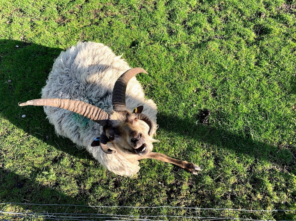 Toen we lipen naar de winkel, ik zag een schaap met vier hoornen!