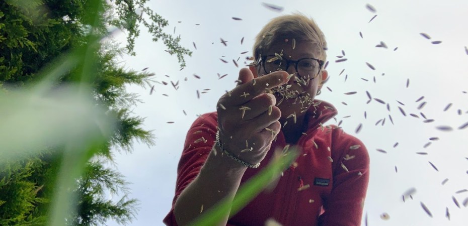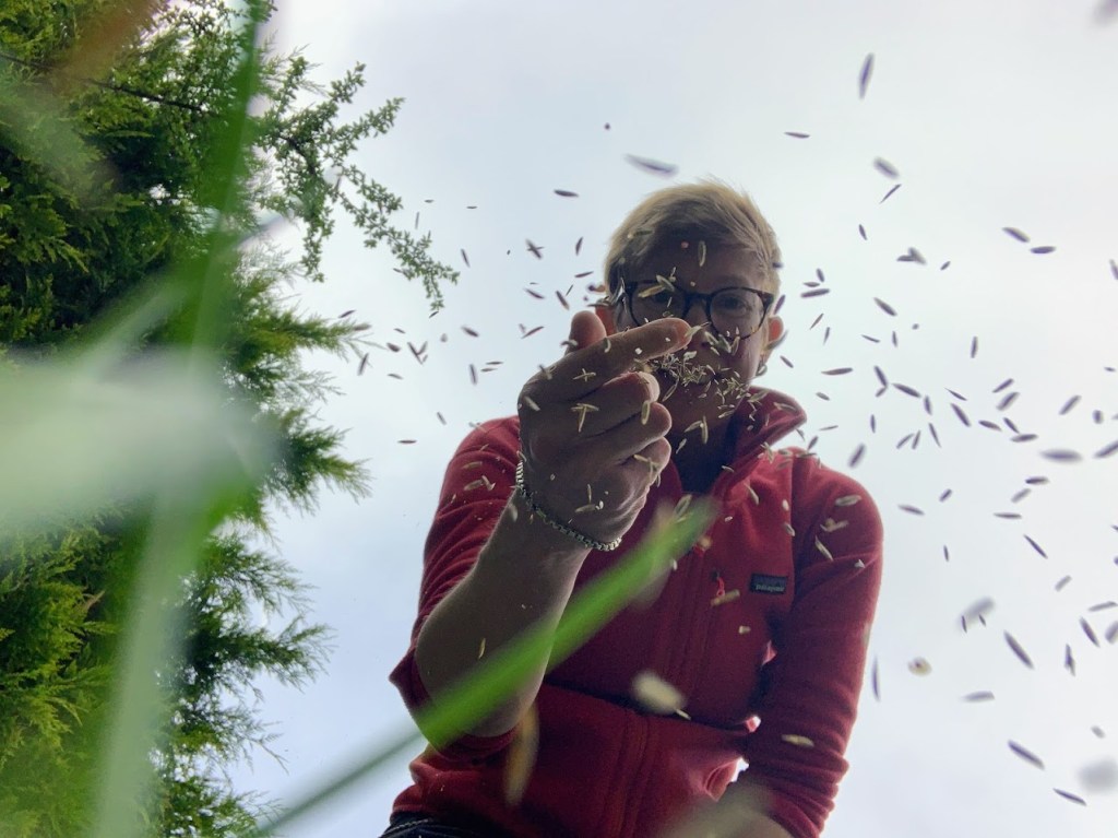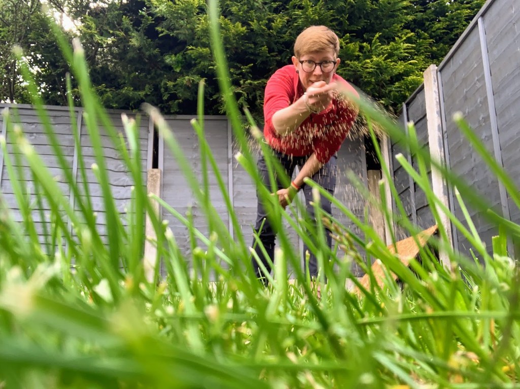 Toen ik had de grond klaar, het was tijd vood zaaien. Ik had een tas van zaden dat ik heb van internet gekocht. Er zijn klaver en madeliefjes zaden. Ik kies deze zaden want ze zijn goed voor bijen en ook gemakkelijke om te onderhouden. Je kan maai het maar een keer of twee keer in een jaar!