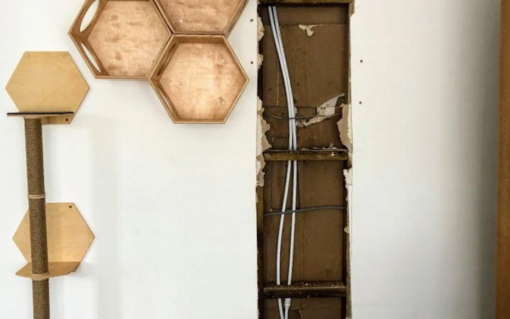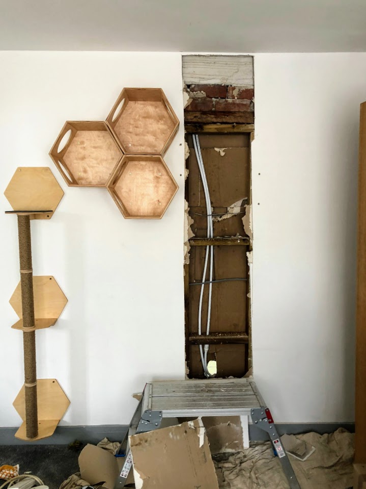 Snell, was ik uitpakken voor het probleem oplossen, maar er was niet water in de doos. Dan dacht ik dat wanner we stoppen de kattenboom, een pijp geboord. Dus, ik belde onze loodgieter.