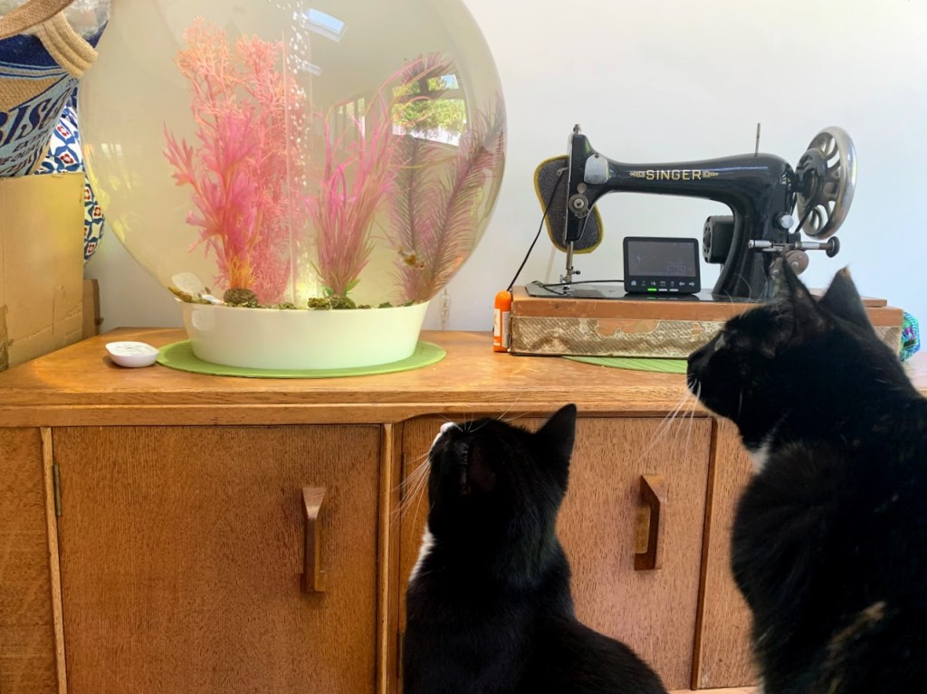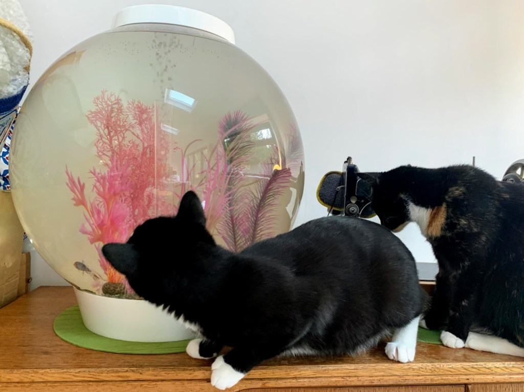 Het was niet lang voor de katten de zissen zaggen! Het was heel grappig! De kleine katten waren op de aquatium tikken!