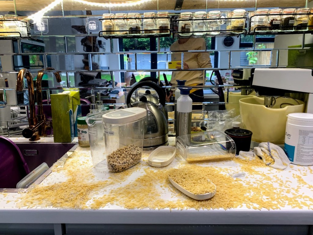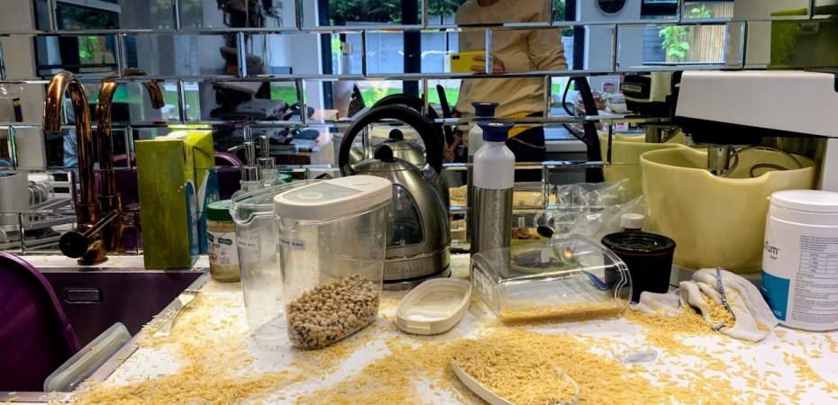 Er was een ramp in mijn keuken! Ik was op mijn bureau zitten, dan een grote verplatteren! Ik rende de trap af en vond de ramp in de keuken! Alle rijst, couscous en orzo op de vloer en aanrechtblad!