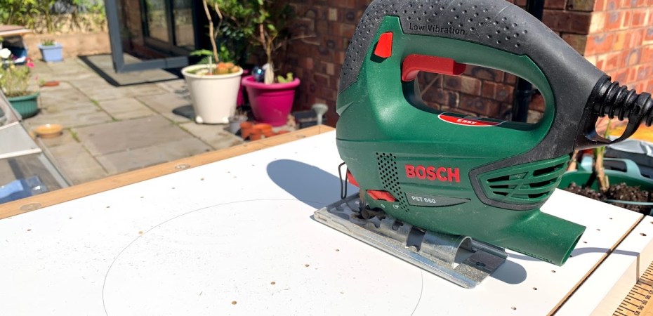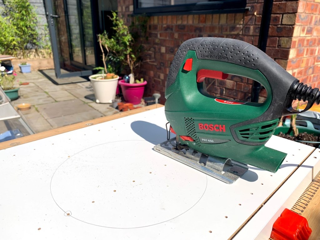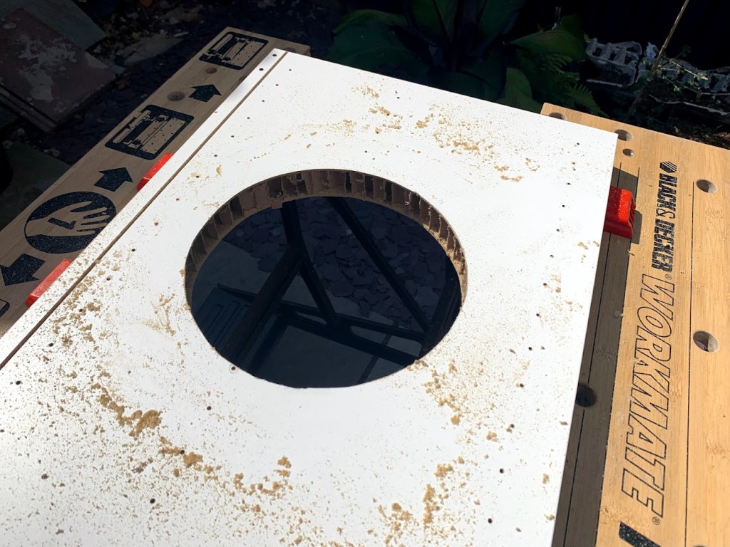 Ik bouwde de kast dan ik snijd een cirkel in de middel. Dit is voor de katten doorheen gaan.