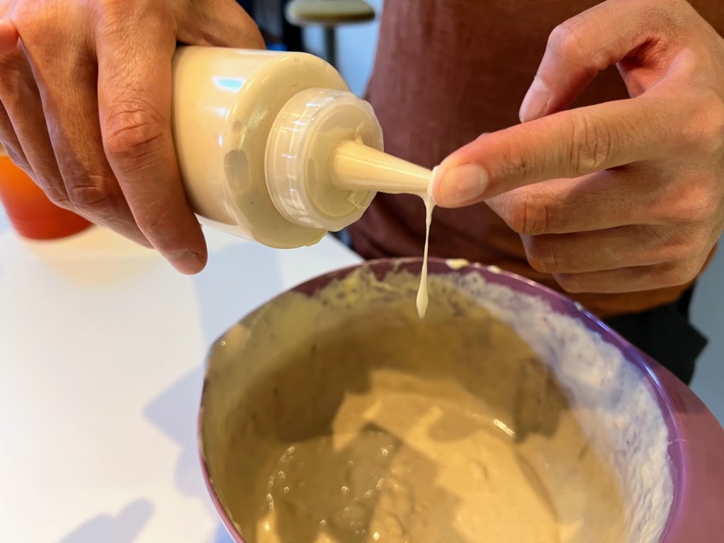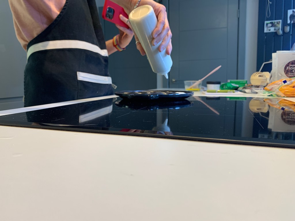 Toen mijn beslag was klaar, ik stopt het in mijn knijpfles. Wat ik wist het niet was dat het is een erg levendig beslag!! Het was uit de flessenmondstuk komen!!