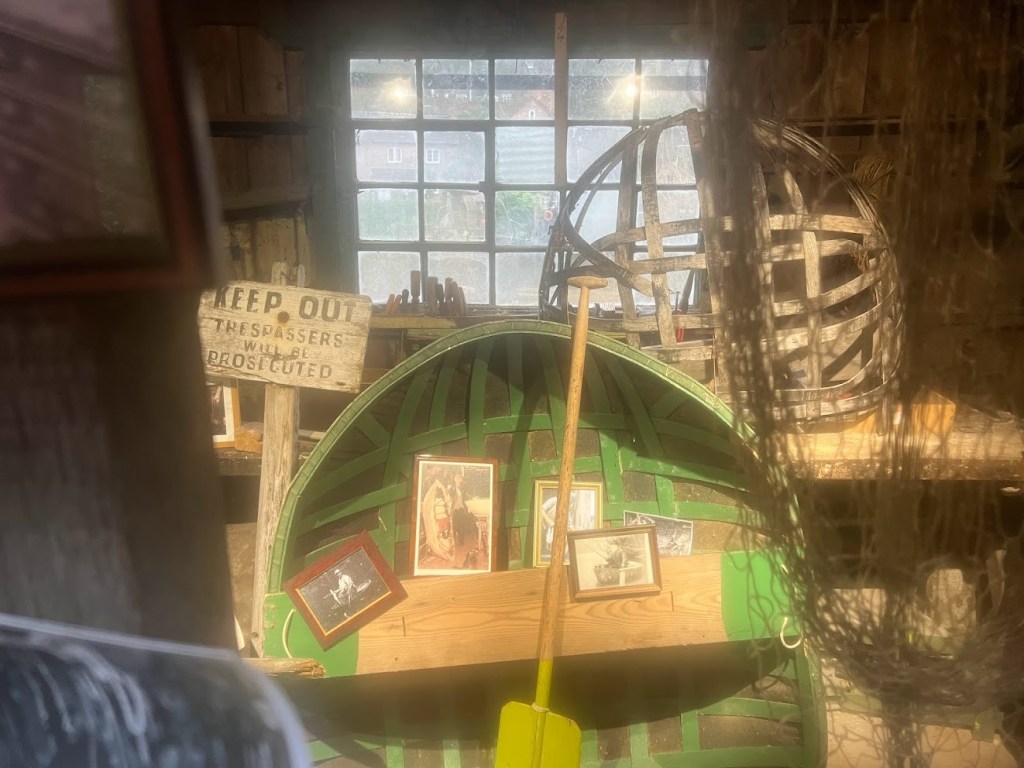 Er is een lang pad naast de rivier voor wandeling. We lipen tot de kleine hut (midden links op foto) om kijk te nemen. Het is een oude coracle schuur. De plek voor de kleine ronde boten van ouderwets. Wij zagen de nieuwe coracle schuur bij de cafe waar we lunch hadden.