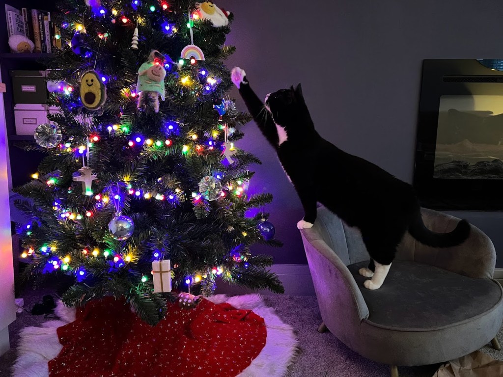 In de ochtend ik was onze maaltijd plannen. Het is mijn zaterdag baan. Ik ook boodschappen doen online. Mijn katten waren ondeugende met onze decoraties. Zij kozen verschillinde kerstballen om met te spelen, hun favoriet was Ampelmann van Berlin!