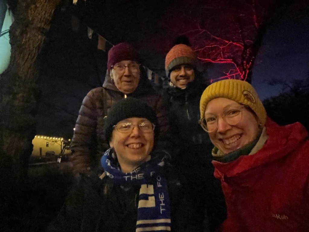 Het was koud in het avond, dus we hadden veel kleren op onze lichamsdeelen. Hoeden, handschoenen, sjaals en dik socken. We waren blij voor de lagen.