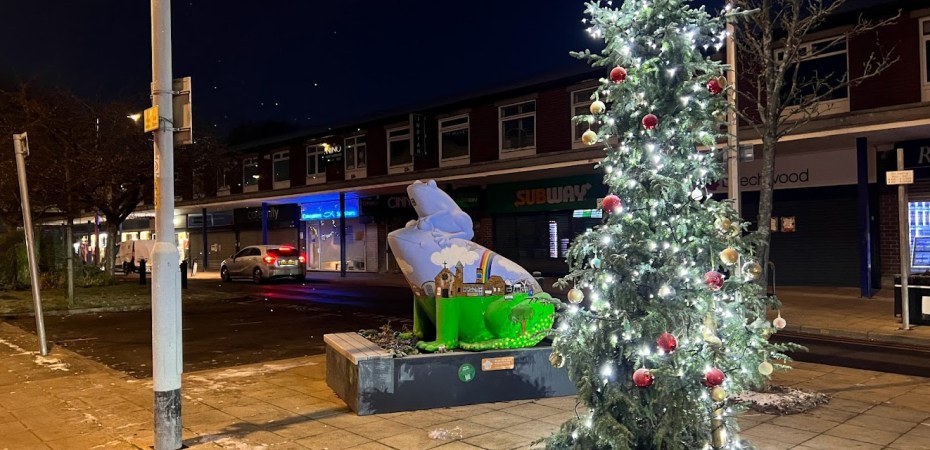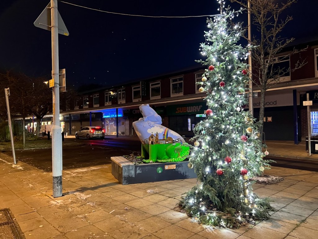 Deze ochtend dacht ik een goed idee om een van onze dorp kerstbomem te delen. Deze boom zit in het midden van onze dorp bij onze winkelen. De kikker is van een feest in Stockport en heeft schilderijen van gebouwen in onze dorp. Hij is een grappig additie tot onze straat.