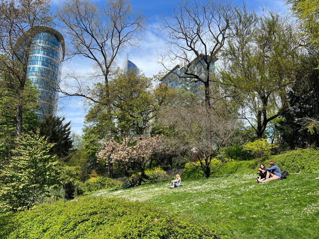 Ik wist niet wat een leuke plek het daar in de buurt was. Bloemen en stoelen in het park en ook een grote groep gebouwen. We zatten met een koffie en speculaas in de zon kijken naar de mensen.