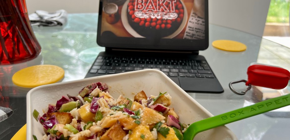 Vandaag had ik een restje tofu en mango salsa buddha bowl met pindakaassaus over. Tijdens mijn lunch kijk ik graag naar Nederlandse tv-programma’s. Op dit moment kijk ik Heel Holland Bakt en het is de kerstaflevering.