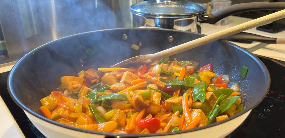 Met de tofu waren uien, peultjes, wortels en paprika. Ik bakte de tofu in de oven en kookte de rijst op de kookplaat. We maken de papadums in de magnetron omdat het snel is. Het is ook mijn lunch morgen!