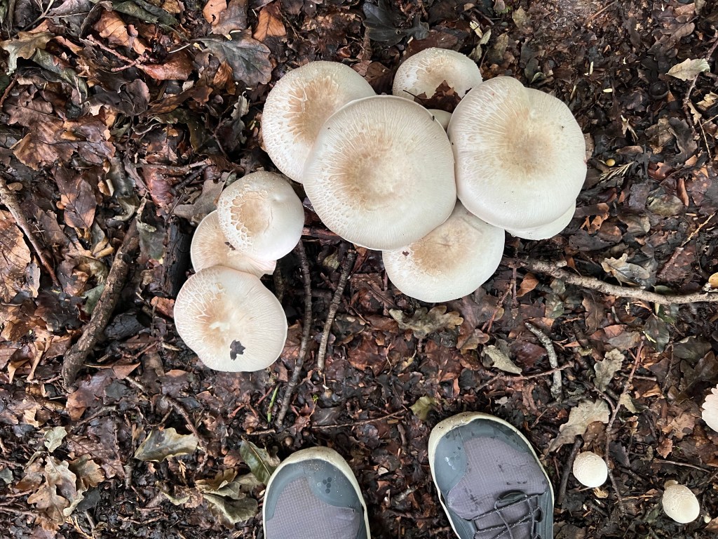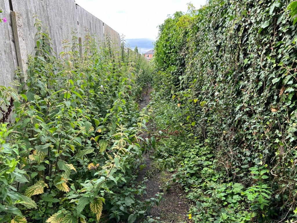 Er is een doorgang (we noemen ze een “ginnel” in Noord-Engeland) op weg naar kattenoppas. Ik dacht dat het sneller zou zijn, maar ik werd tegengehouden door te veel planten op het pad, dus moest ik terug. Er waren echter enkele grote paddenstoelen!
