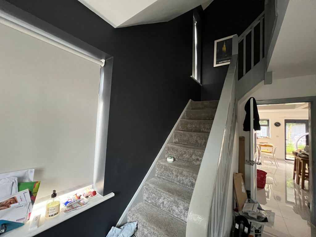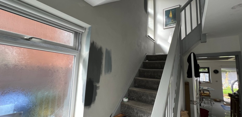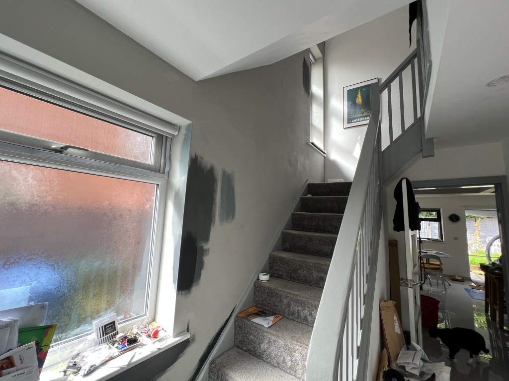 Het was bijna 30 graden met volle zon. Onze trap bevindt zich ook aan de zuidkant van ons huis. Het was heet! Tussen de kattenoppasbezoeken door schilderde ik de muur bijna zwart van wit. Ik zal foto’s aan de muur hangen zodat ze opvallen.
