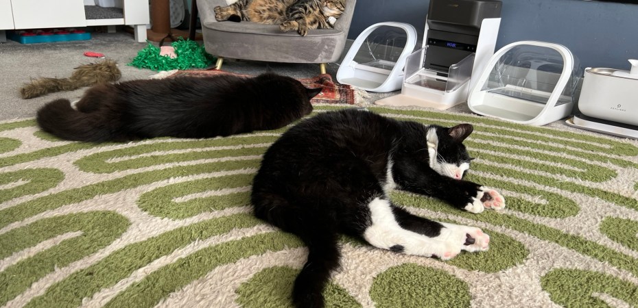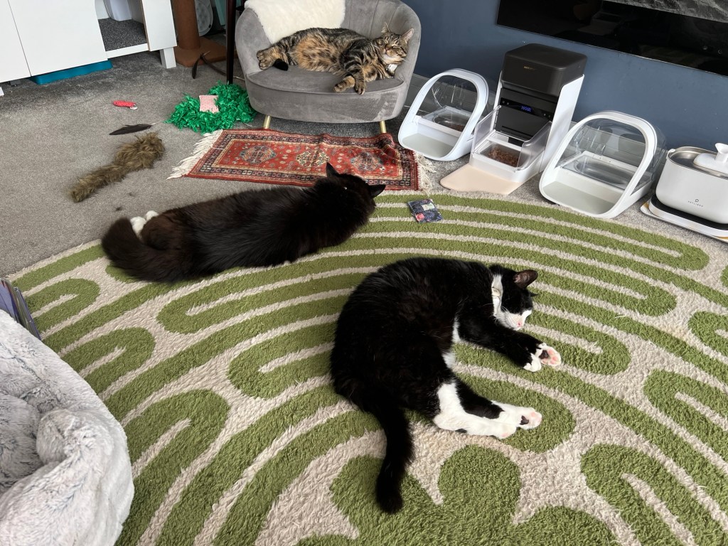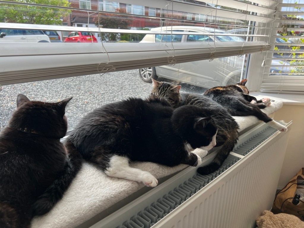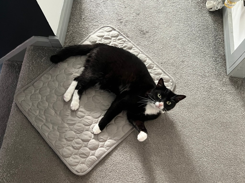 Terwijl ik het warm had, hadden mijn katten het warmer met hun vacht en alleen hun zwetende pootjes. Ik probeer het koel voor ze te houden met ventilatoren, koelmatten en tijd in de catio als het nog niet zonnig is. Maar soms slapen ze toch op wollen dekens!!!